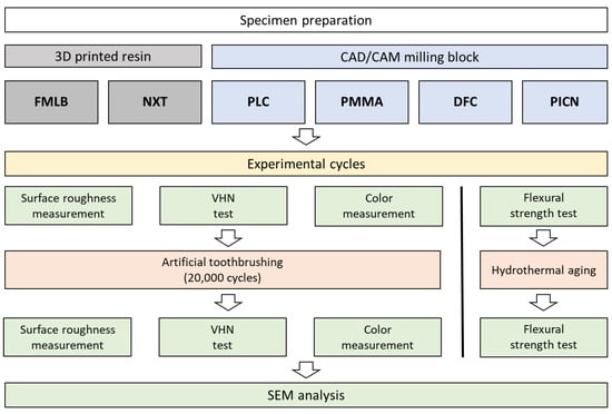 Overall experimental workflow showing the materials used and experimental cycles. Material names are coded as follows: FMLB (Formlabs denture teeth A2 resin), NXT (NextDent C&B), PLC (polycarbonate), PMMA (polymethylmethacrylate), DFC (dispersed-filler composite), and PICN (polymer infiltrated ceramic network).