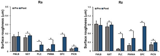 After measuring the Ra and Rz of six materials before and after artificial toothbrushing, a paired-sample t-test was performed to identify any difference after toothbrushing (Figure 3 and Table S1). Regarding FMLB, the Ra values before and after artificial brushing were 0.17 ± 0.02 μm and 0.17 ± 0.05 μm, respectively, with no significant difference (p = 0.837); the corresponding Rz values were 0.92 ± 0.11 μm and 0.89 ± 0.07 μm (p = 0.508). However, in all groups except FMLB, the Ra and Rz values increased significantly after toothbrushing: NXT (Ra; p = 0.006, Rz; p = 0.028), PLC (Ra; p < 0.001, Rz; p < 0.001), PMMA (Ra; p = 0.002, Rz; p = 0.003), DFC (Ra, p < 0.001; Rz, p < 0.001), and PICN (Ra, p = 0.004; Rz, p = 0.008).