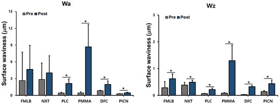 Wa and Wz were measured before and after artificial toothbrushing on six materials, and paired-samples t-tests identified any significant difference after artificial toothbrushing for each material (Figure 4 and Table S1). The paired-samples tests suggested that the Wa and Wz values of the posttest significantly increased in all groups except for Wa in FMLB (p = 0.309) and NXT (p = 0.367): FMLB (Wz, p < 0.001), NXT (Wz, p = 0.011), PLC (Wa, p < 0.001; Wz, p < 0.001), PMMA (Wa, p < 0.001; Wz, p < 0.001), DFC (Wa, p < 0.001; Wz, p < 0.001), and PICN (Wa, p = 0.001; Wz, p < 0.001).