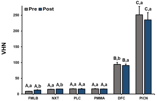 Surface hardness (data are mean and standard-deviation values) of six materials pre- and post-artificial toothbrushing. A significant difference in surface hardness between materials is indicated by different upper-case letters, and a significant difference in surface hardness between pre and post artificial toothbrushing is indicated by different lower-case letters (p < 0.05).