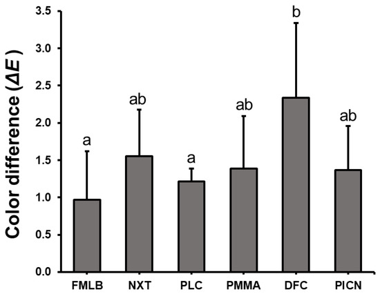 The colors of the materials were measured and then compared between, before, and after artificial toothbrushing. One-way ANOVA was performed to identify differences in color changes between materials (Figure 6, Table S3), which revealed a significant difference in color difference between groups (F = 6.095, p < 0.001). The color difference between FMLB and PLC was significantly lower than for the other samples, at 1.0 ± 0.6 and 1.3 ± 0.3, respectively. The color differences of NXT, PMMA, and PICN were 1.6 ± 0.6, 1.4 ± 0.9, and 1.6 ± 0.8, respectively, and the color difference of the DFC group was 2.4 ± 0.9, which was significantly larger than those of the other groups. Color differences larger than ΔE = 2.25 were considered clinically observable; the ΔE values of all materials, except for the DFC group, reached this criterion.