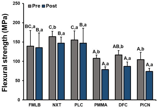 Flexural strength results of six materials pre and post toothbrushing. A significant difference in flexural strength between materials is indicated by different upper-case letters, and a significant difference in flexural strength between pre and post artificial toothbrushing is indicated by different lower-case letters (p < 0.05).