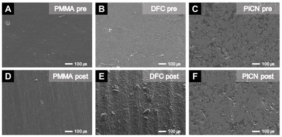 Surface conditions of the specimens, pre- and post-artificial toothbrushing, in SEM images at 1000-times magnification. Surface changes occurred after artificial toothbrushing, with the degree of difference depending on the material. The Rz change in DCF appeared to be the largest, and shallow streaks appeared on the surface of the PMMA specimen. The PICN surface was almost unchanged. (A) PMMA pre, (B) DFC pre, (C) PICN pre, (D) PMMA post, (E) DFC post, and (F) PICN post.