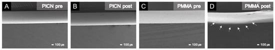 SEM images of cross sections at 35-times magnification. There was no significant change in the surface of PICN between pre and post artificial brushing, whereas PMMA had a concave planar shape after brushing due to abrasion. The arrows in panel D indicate the concave, worn surface of the PMMA specimen. (A) PICN pre, (B) PICN post, (C) PMMA pre, and (D) PMMA post.