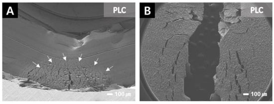 SEM images of the PLC specimen after its flexural strength test at 30-times magnification. The PLC specimens were high elasticity did not break easily. Many fatigue crack lines were observed on the fracture surface. The arrows in panel indicate the fatigue crack lines. (A) Unbroken PLC specimen after fracture test, and (B) top side of a broken specimen after the flexural strength test.