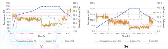 Technological parameters of the modification process of heat-treated wood at 160 °C (a), and at 200 °C (b).