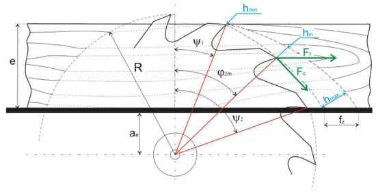 The circular sawing process scheme (Figure 3) indicates that the angle of fiber cutting varies. At the point of tooth contact with the workpiece, it is equal to the entry angle, ψ1 (at this point, the uncut chip thickness has the minimum value, hmin). At the point of circular sawblade teeth disengagement, it is equal to the exit angle, ψ2 (the maximum uncut chip thickness, hmax, is reached). The mean fiber cutting angle, φ2m, is then equal to the average value of both angles. When calculating, the mean uncut chip thickness, hm, is considered; it is determined at the point of the mean fiber cutting angle, φ2m.