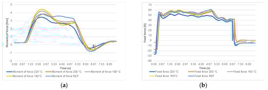 (a)The moment of force for feed rate 10 m·min−1; (b) feed force for feed rate 10 m·min−1.