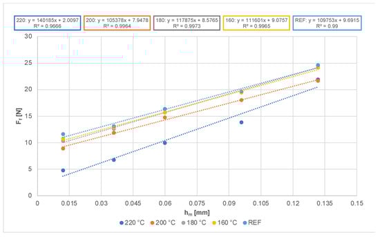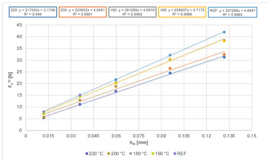 The graph of the cutting forces per single tooth, dependent on the size of the mean uncut chip thickness (Figure 5), shows that the cutting force increases with an increasing mean uncut chip thickness. This dependence is linear, as confirmed by [44,45,46]. Moreover, the graph indicates the effect of the modification temperature on the value of the cutting force for individual thermally modified wood samples and for the unmodified spruce sample. Figure 5 clarifies that modified wood behaves differently from unmodified spruce samples during machining.