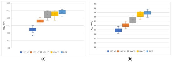 Figure 7a,b summarize the fracture toughness and shear yield strength in boxplots to illustrate the influence of the modification temperature on these fracture parameters. The comparison of the results between the fracture properties, given in Table 5 and Figure 7a,b, shows that the fracture toughness and shear yield strength of the thermally modified wood is not only dependent on density, but also on the modification temperature and its influence on the changes in the internal structure and the degradation of cell wall components.