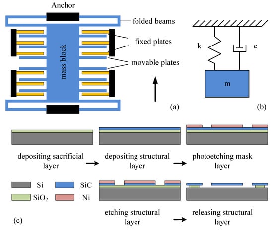 Model of a single-axis, comb-type capacitive micro accelerometer. (a) Physical model of the accelerometer, (b) mechanical model of the accelerometer, (c) process flow of the accelerometer.