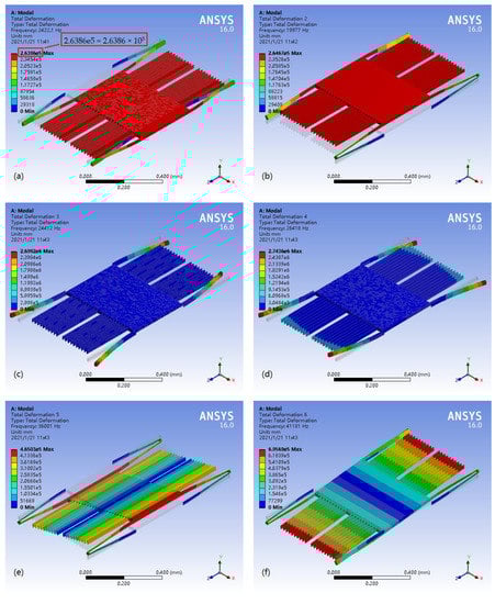 In the modal analysis, it was assumed that the density, Young’s modulus, and Poisson’s ratio of silicon carbide were 3200 kg/m3, 4.3 × 1011 Pa, and 0.17 [48], respectively. With this in mind, a modal analysis of the capacitive micro-accelerometer with folded support beams fixed on the anchors was carried out. The analysis results are shown in Figure 4. The accelerometer has six main modes, including natural frequencies and mode shapes in six degrees of freedom. As can be seen from the mode shape in Figure 4a, the first mode is the translational motion along the x-axis, which is sensitive to external acceleration, so it needs to be strengthened. Figure 4b,c shows that the second and third modes are the non-sensitive vibration modes that move along the y axis and z-axis, respectively, so they need to be suppressed. Similarly, as shown in Figure 4d–f, the fourth, fifth, and sixth modes are the rotational motions around the y-axis, z-axis, and x-axis, respectively, and they also need to be suppressed. The natural frequencies from the first mode to the sixth mode of the accelerometer were 2422.1; 19,977; 24,412; 26,418; 36,001; and 41,181 Hz, respectively.