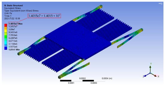 Then, structural strength analysis of the accelerometer was carried out at room temperature. Figure 11 shows the stress distribution of the accelerometer under the acceleration of 100 g along the x-axis. It can be seen that large stresses existed at the connection between the folded beam and the mass block, the connection between the folded beam and the anchor and the corner of the folded beam, but its maximum value (14.015 MPa) was much less than the flexural strength of silicon carbide (359 MPa). Therefore, under a large acceleration, the structure could still maintain a good shape without fracturing.