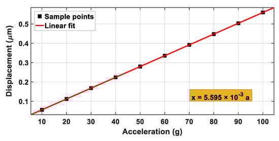 The mechanical sensitivity of the accelerometer is one of the important indexes that which represents the corresponding displacement generated by the acceleration per unit. Ten groups of simulation experiments under different accelerations were made at room temperature, and the experiment results are shown in Table 2. The relationship between the displacement and the acceleration was plotted as Figure 12, and it could be derived from linear regression as follows: