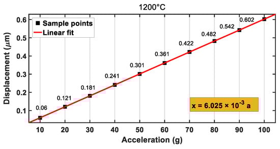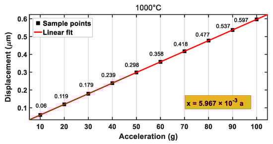 In the mechanical analysis, characteristic parameters of silicon carbide at different temperatures (see Table 3) were set in Ansys. Then, the temperature of the accelerometer was set to the corresponding value (500, 1000, 1200 °C). In the case, the dependences of the displacements of the accelerometer on the external accelerations at 500, 1000, and 1200 °C are shown in Figure 13, Figure 14 and Figure 15, respectively. When the temperature was increased to 500, 1000, or 1200 °C, the final deformations of the accelerometer were 0.585, 0.597, and 0.602 μm, respectively, under the external acceleration of a = 100 g, which was less than the gap distance between the moving and fixed electrode plates (). After the linear fitting of the sample points, the mechanical sensitivities of the accelerometer were 0.0058, 0.0059, and 0.0060 μm/g, respectively. By comparing the sensitivities of the accelerometer at different temperatures, it was found that the sensitivities increased with the increase in temperature, but the change was not very notable, which was conducive to the measurement of the accelerometer at high temperatures. Therefore, the SiC-based accelerometer had the advantage of low temperature sensitivity, which leads to high reliability.