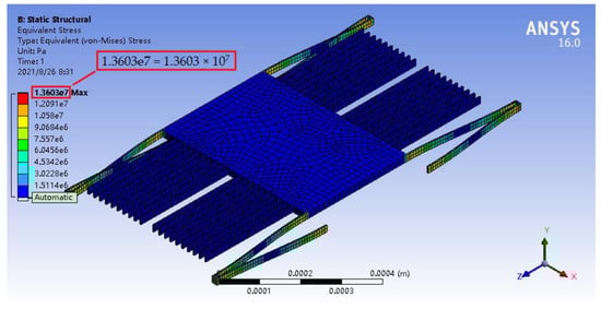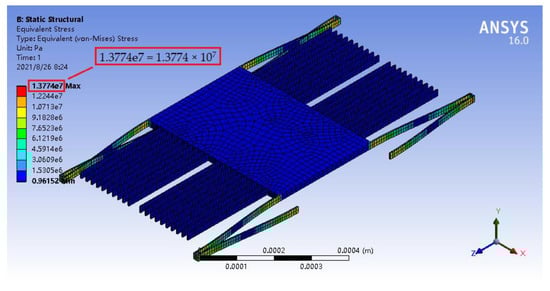 In the structural strength analysis, its parameter setting and temperature setting were similar to those in the mechanical analysis. In the case, when the external acceleration was a = 100 g, the maximum stresses of the accelerometer at 500, 1000, and 1200 °C were 13.774, 13.646, and 13.603 MPa, respectively, as illustrated in Figure 16, Figure 17 and Figure 18, which were far less than the flexural strengths of silicon carbide at high temperatures (see Table 3).