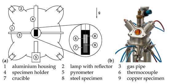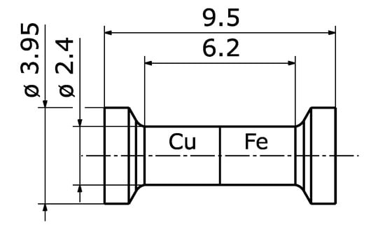 The specimens were cut from rods with a diameter of 4 mm and ground to a length of 5 mm on a 600 grit abrasive paper. Thus, a uniform surface roughness Ra of approximately 0.4 m for the steel and 0.5 m for the copper specimens was achieved, leaving its influence on wetting and diffusion to a minimum. One in six Fe specimens was fitted with a hole reaching close to the opposite face. Prior to heating, the specimens were degreased in an ultrasonic bath, filled with ethanol. The steel specimens were coated on their circumference with HeBoCoat® (Lauben, Germany) boron-nitride coating to prevent reactions with the graphite crucible, while leaving the face to be in contact with the copper specimen blank. To achieve a more uniform bonding area, the steel specimen was placed on top of the copper specimen in the crucible. A thermocouple was fed through the specimen holder and either installed into the hole or rested on the top face of the steel specimen. Then the crucible was screwed onto the specimen holder and both were inserted into the furnace chamber.