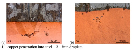 Both an increase in maximum temperature and dwell time result in increased solution of iron in the liquid copper. The results are an increasing number and size of iron droplets within the copper grains and an increasingly rough interface due to an inhomogeneous diffusion speed.