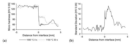 Figure 5a shows the microhardness, starting from the open steel face, across the interface up to the free copper face of the specimen. The same specimen are shown as above, namely, those featuring extrema of maximum temperature and dwell time. The hardness values show little fluctuation while within the steel, followed by a sharp drop into the copper. Depending on the extent of steel diffused into the copper, a plateau of hardness values forms at the interface, reaching more or less into the copper. Additionally, a slight increase of hardness where the copper penetrates into the steel is discernible. The hardness values inside the copper are more unsteady, possibly due to as cast structure and segregation effects.