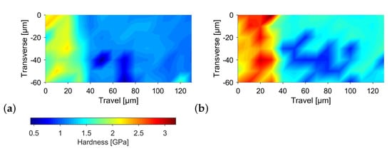 Figure 6 shows hardness values generated by the nanoindenter. The measuring grid contained 7 by 14 indents equally spaced at 10 m. The interface can be seen at a longitudinal of approximately 30 m. Therefore, the first three rows of the grid oriented in transverse direction lie within the steel. Both images show a significant difference of hardness in steel and copper. Image a shows the same specimen as introduced above, produced at a maximum temperature of 1090 °C and without a dwell time. Here, a rather uniform hardness distribution in each zone can be seen, which varies around 2 GPa in steel and around 1 GPa in copper. Image b shows the specimen produced at a maximum temperature of 1150 °C and a dwell time of 30 s. The hardness values are on average around 0.5 GPa higher than those mentioned previously. Only the minima match each other in both images. This leads to the conclusion that the base material, represented by the minima is unaffected by the different temperature-time history. The higher maxima in image b are a result of a higher diffusion activity. As such, both steel and copper have their hardness increased locally, confirming the findings of an increased microhardness within the steel interface.