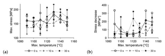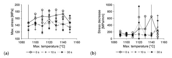 Figure 8 shows the results of the torsion tests. Yet again, the data consists of 5 specimen for each temperature-time profile. Maximum stress values remain relatively constant for a dwell time of 0 s, only showing one outlier at 1130 °C. A dwell time of 30 s results in a pronounced increase of maximum stress at higher temperatures, preceded by a drop in values at 1120 °C. The maximum stress values of a dwell time of 10 s show a slight increase with temperature, dropping only at the highest temperature of 1150 °C.