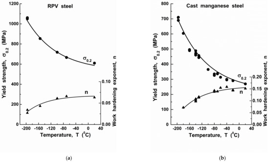 The temperature dependences of yield strength and work hardening exponent for RPV steel (a) and cast manganese steel (b).