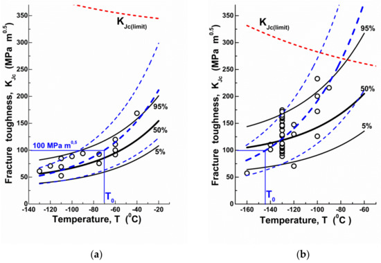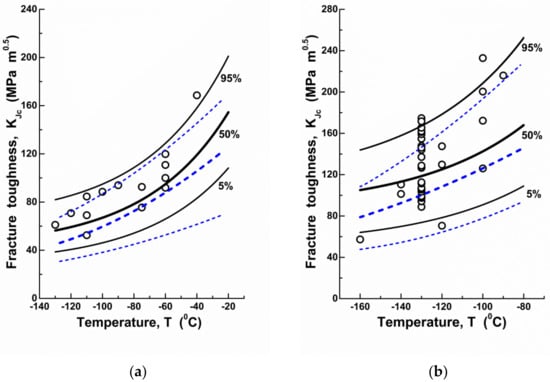 Based on these data, temperature dependences of fracture toughness for the studied steels were plotted (Figure 3a,b). The algorithm of calculations of fracture toughness and fracture probabilities was as follows: