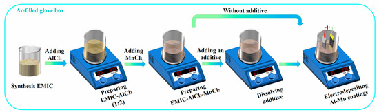 Electrodeposition was conducted in a two-electrode cell in the Ar-filled glove box, using a power source (YS9000DDB-1220, Shanghai Yi Sheng Electronics Co., Shanghai, China). Highpurity Al plates (99.999%, 2.5 cm × 3 cm) were used as the anode, and the copper (Cu) plates (1 cm × 4 cm) were used as the cathode. The distance between the anode and the cathode was about 20 cm. Prior to each electrodeposition, the Cu plates were mechanically polished with a 4000# grit waterproof abrasive paper, then ultrasonically cleaned by deionized water and anhydrous ethanol, respectively. After the cleaning, a part of each substrate was covered with PTFE tape so that a square area (1 cm × 1 cm) could be exposed. Al plates were polished and rinsed in sodium hydroxide solution, deionized water and ethanol prior to use, respectively. In order to prevent reoxidation, the dried plates were transferred to the Ar-filled glove box with the least delay possible. The Al-Mn coatings on Cu substrates were electrodeposited with a constant-current mode of 10 mA·cm−2 for 30 min. During the electrodeposition, the bath was stirred at 230 rpm and the temperature of the bath was kept at 303 K with a thermostat (RET basic, IKA, Staufen, Germany). After electrodeposition, all coating specimens were immediately transferred from the glove box, washed in succession by deionized water and ethanol, and finally dried with air. The Al-Mn coatings electrodeposited from EMIC-AlCl3-MnCl2 bath containing no additives, 6 mmol·L−1 4-hydroxypyridine, 6 mmol·L−1 4-picolinic acid, and 6 mmol·L−1 4-cyanopyridine additives were labeled as Al-Mn-BK, Al-Mn-HP, Al-Mn-PA, and Al-Mn-CP, respectively. The schematic diagrams of whole fabrication procedures about the Al-Mn coatings were depicted in Figure 1.