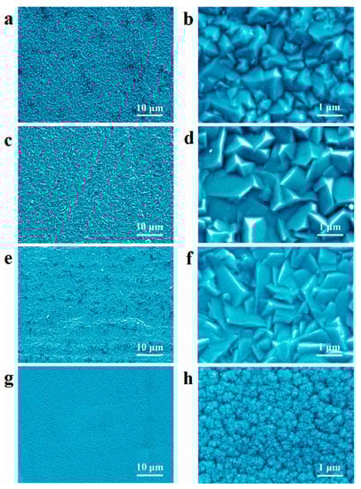 SEM images obtained for the (a,b) Al-Mn-BK, (c,d) Al-Mn-HP, (e,f) Al-Mn-PA, and (g,h) Al-Mn-CP coatings. (a,c,e,g) are the corresponding SEM images of coated samples at a 2000× magnification, (b,d,f,h) are the corresponding SEM images of the coated samples at a 20,000× magnification.