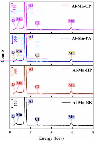 EDS spectrum of various electrodeposited Al-Mn coatings. From bottom to top are the EDS spectra of the Al-Mn-BK, Al-Mn-HP, Al-Mn -PA, and Al-Mn-CP coatings.