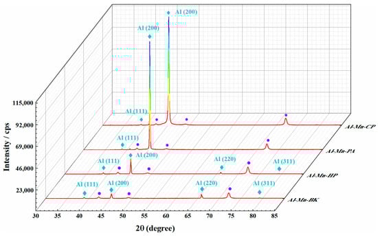 Figure 4 reveals the XRD patterns of the Al-Mn-BK, Al-Mn-HP, Al-Mn-PA, and Al-Mn-CP coatings. For the Al-Mn-BK coating, the diffraction peaks of the Al and Cu substrates were confirmed from the XRD patterns. Among them, the four characteristic diffraction peaks (denoted by