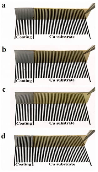The brightness of the Al-Mn coatings was evaluated by observing whether they could reflect the front stripes. The brightness of the metal coatings was related to the smoothness of the surface. As shown in Figure 5a, the Al-Mn-BK coatings obtained from the pure EMIC-AlCl3-MnCl2 bath presented a dull surface and did not legibly reflect the stripes in front of it. The matte Al-Mn-BK coating composed of Al-Mn particles with a size range of 0.2–1.5 μm resulted in the irregularity of the coating surface with an average roughness of about 243 nm (Table S2) []. The Al-Mn-HP coating remained a lusterless surface (Figure 5b); its average roughness was about 239 nm (Table S2), which was mainly due to its micron-sized grains. The Al-Mn-PA coating with micron grains reflected the stripes clearer than the Al-Mn-BK and Al-Mn-HP coatings (Figure 5c). This could be attributed to its strong grain preferential orientation, which made the coating surface flatter with an average roughness of approximately 76 nm (Table S2). The Al-Mn-CP coating exhibited a silvery and mirror-like bright appearance and reflected the stripes (Figure 5d). The SEM images (Figure 2g,h) and the XRD spectrums (Figure 4) of the Al-Mn-CP coating revealed that the 4-cyanopyridine additive led to the coating grain size reaching the nanometer level and possessing a strong (200) crystal plane preferential orientation, which made the coating attained a smooth surface with an average roughness of only 18 nm (Table S2) [,]. Therefore, the Al-Mn-CP coating was bright.