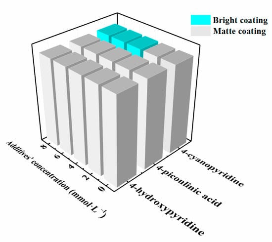 The statistical results of the quality of the Al-Mn coatings electrodeposited at 303 K in EMIC-AlCl3-MnCl2 containing no, 4-hydroxypyridine, 4-picolinic acid, and 4-cyanopyridine at different additive concentrations (2 mmol·L−1, 4 mmol·L−1, 6 mmol·L−1, and 8 mmol·L−1). The cyan blue columns represent that the deposited Al-Mn coatings are bright, and the gray columns represent that the deposited Al-Mn coatings are matte.