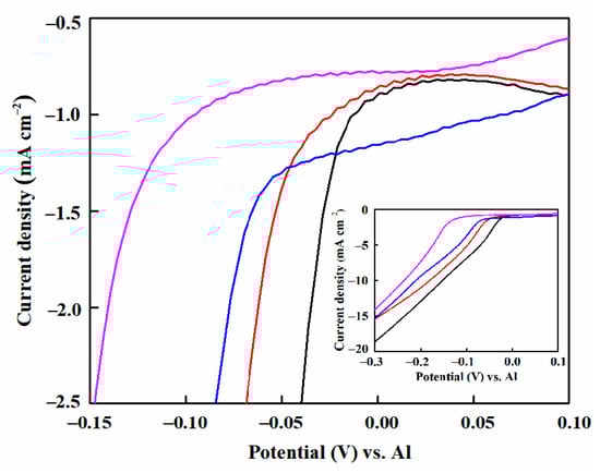 The cathodic polarization curves of the copper substrates recorded in EMIC-AlCl3-MnCl2 without and with pyridine derivative additives at 303 K are shown in Figure 7. As shown in Figure 7, the bulk deposition of Al-Mn started at ca.−20 mV vs. Al in the EMIC-AlCl3-MnCl2 bath solution []. When 6 mmol·L−1 4-hydroxypyridine and 4-picolinic acid were added separately as the additives, a slightly negative shift in the onset potential of the deposited Al-Mn was detected. However, the initial deposition potential of the Al-Mn underwent a considerable negative migration in the EMIC-AlCl3-MnCl2-4-cyanopyridine (6 mmol·L−1) ionic liquid, shifting to ca. −120 mV vs. Al. The shift implied that a high overpotential was required to initiate the nucleation and subsequent growth of Al-Mn in the ionic liquid, leading to an increased rate of Al-Mn nucleation, and thus a decrease in grain size. []. In addition, it is worth noting that compared with the EMIC-AlCl3-MnCl2 ionic liquid, the addition of the pyridine derivative additives promoted the decrease in the cathodic deposition current at the identical deposition potential (Figure 7 inset). This indicates that the deposition process of Al-Mn was inhibited by adding these additives. Moreover, the ability of these additives to hinder Al-Mn deposition is as follows: 4-cyanopyridine > 4-picolinic acid > 4-hydroxypyridine.