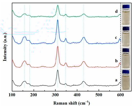 Raman spectra and photographs of the EMIC-AlCl3-MnCl2 ionic liquids containing (a) no, and 6 mmol·L−1 (b) 4-hydroxypyridine, (c) 4-picolinic acid, and (d) 4-cyanopyridine additives.