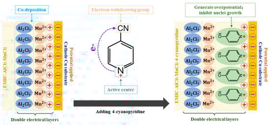Based on the double electrical layer’s theory, the schematic diagram of the mechanisms of 4-cyanopyridine in the EMIC-AlCl3-MnCl2 ionic liquid is displayed in Figure 9. In the EMIC-AlCl3-MnCl2 ionic liquid, the matte Al-Mn coating was co-deposited smoothly, and there was almost no hindrance during the deposition process. Wang et al. [] had reported that the active center of pyridine derivative additives is the nitrogen atom of the pyridine ring. On the pyridine ring of the 4-cyanopyridine additive, the cyano group with strong electron-withdrawing ability caused the electron density around the nitrogen atom to decrease, which was conducive to the additive adsorbed onto the cathode when a potential was applied. The adsorbed 4-cyanopyridine primarily had the following two actions: (1) generating overpotential to promote Al-Mn nucleation; (2) inhibiting the growth of the deposited nuclei and making them grow preferentially. Under the combined action, a mirror-like bright Al-Mn-CP coating with nanocrystals and smooth surface was fabricated.
