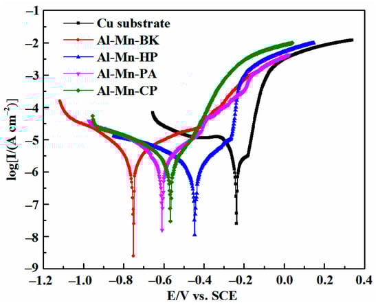 Potentiodynamic polarization curves of the Cu substrate, Al-Mn-BK, Al-Mn-HP, Al-Mn-PA, and Al-Mn-CP coatings in a 3.5 wt % NaCl solution at a scan rate of 1 mV s−1.