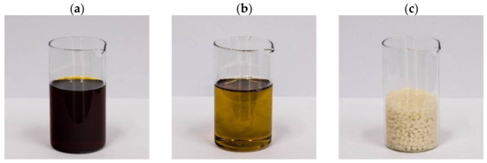 Photographs of the studied additives: (a) Wetfix BE, (b) Rediset LQ, and (c) Sasobit.