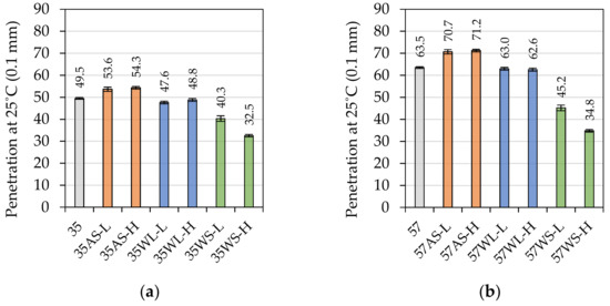 Penetration at 25 °C of the investigated asphalt binders based on the (a) 35/50- and (b) 50/70-penetration bitumen.