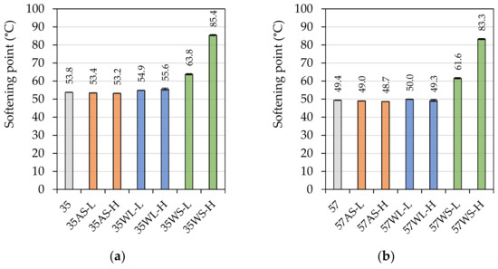 Softening point of the investigated asphalt binders based on the (a) 35/50- and (b) 50/70-penetration bitumen.