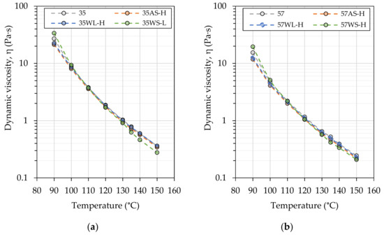 Dynamic viscosity of the investigated asphalt binders based on the (a) 35/50- and (b) 50/70-penetration bitumen.