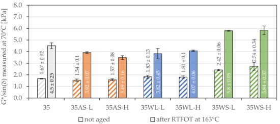 To quantify the effects shown in Figure 5 and Figure 6, the comparison of the relative changes in the G*/sin(δ) parameter values are shown before and after short-term aging caused by the use of the analyzed additives in Table 7. In the 35/50 base asphalt binder, both the AS and the WL liquid additive limited the aging processes caused by RTFOT ageing. Such a statement is possible thanks to the observation of the significantly reduced high-temperature stiffness of the 35AS and 35WL binders after short-term aging in relation to the 35/50 and 50/70 binders without these additives. This effect was not observed for the 50/70 asphalt binder.