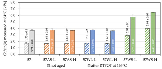 The results of the high-temperature stiffness (G*/sin(δ)) of the investigated binders based on the 35.50 and 50/70 paving-grade bitumens are presented in Figure 5 and Figure 6. The measured values were obtained at temperatures equal to the high-temperature grades (PG) of the base binders. The results of the statistical analyses are presented in Table 6.
