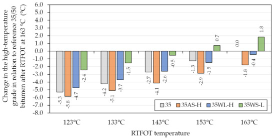 Change in the high-temperature grade of the investigated asphalt binders based on the 35/50-penetration bitumen due to RTFOT ageing in relation to the reference 35/50 bitumen after RTFOT at 163 °C.