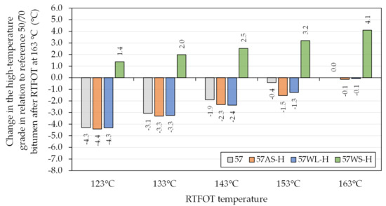 Change in the high-temperature grade of the investigated asphalt binders based on the 50/70-penetration bitumen due to RTFOT ageing in relation to the reference 50/70 bitumen after RTFOT at 163 °C.