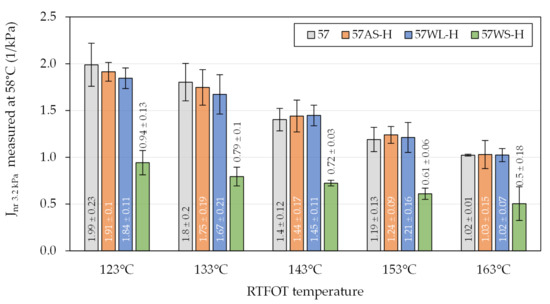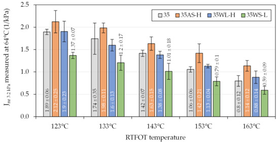 Similar evaluation was conducted in regard to the multiple stress creep recovery (MSCR) characteristic—non-recoverable creep compliance measured at a 3.2 kPa stress level (Jnr 3.2 kPa)—of the selected binders (Figure 9 and Figure 10). The presented figures show the test results of the 35/50 and 50/70 bitumen-based binders obtained at temperatures of 64 °C and 58 °C, respectively. The temperatures were selected to obtain comparable results despite the differences in the stiffness of the binders.
