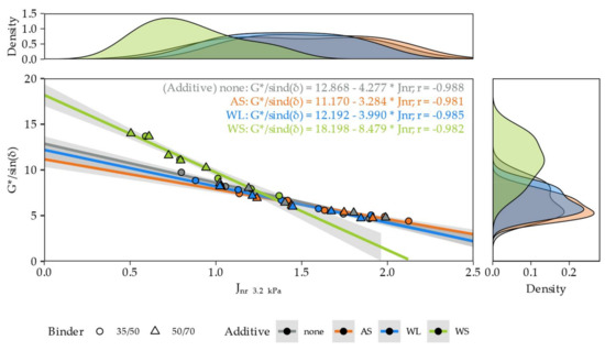 The relationships between the G*/sin(δ) and Jnr 3.2 kPa parameters were highly linear, and their correlations were strongly negative (Pearson correlation coefficients r were between −0.981 and −0.988). These relationships were similar in the case of neat binders and binders with liquid additives (AS, WL). This characteristic of the asphalt binders with the WS additive was distinctly steeper and, as seen on the density plots, shifted towards lower non-recoverable creep compliances and higher values of the high-temperature stiffnesses. The type of the base binder (35/50, 50/70) was found to poorly discriminate the G*/sin(δ) vs. Jnr 3.2 kPa characteristics.