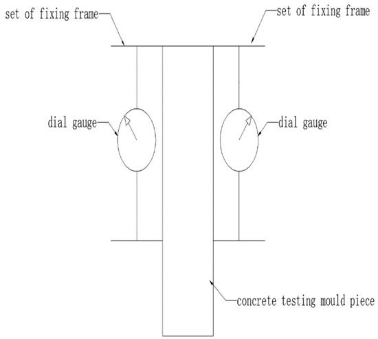 The test method for the elasticity modulus under static pressure was performed as specified in Standard for Test Method of Mechanical Properties on Ordinary Concrete (GB/T 50081-2002) [27]. The test apparatuses, as shown in Figure 3, consisted of one universal testing machine, one ball socket, two dial gauges, two sets of fixing frames for the measuring instrument, and one steel ruler. In the test, the sample size was 150 mm × 150 mm × 300 mm. Two groups of three samples were used. The first group was used for conducting the static compression test to determine the compressive strength and thus the loading basis of the elasticity modulus test. The second group was used for the formal elasticity modulus test.