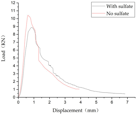 The load–displacement curves for the hybrid fiber–polymer concrete with and without sulfate attack were compared, as shown in Figure 8. Table 5 summarizes the bending strengths of the test groups and the control groups.