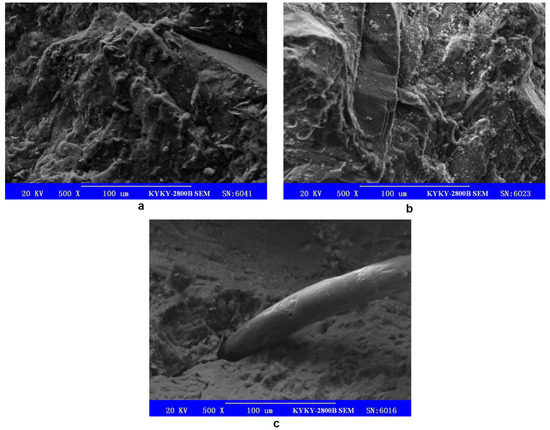 From Figure 9a,b, it can be seen that many microcracks and small pits were present on the surface of the ordinary concrete, while on the surface of the hybrid fiber–polymer concrete, a layer of dense cementing polymer colloid filled a few microcracks and pits, making the whole concrete seem more compact. The hybrid fiber–polymer concrete had fewer microholes and microcracks than the ordinary concrete and thus appeared to be more integrated. This feature might have allowed the hybrid fiber–polymer concrete to show strength and corrosion resistance higher than the ordinary concrete.